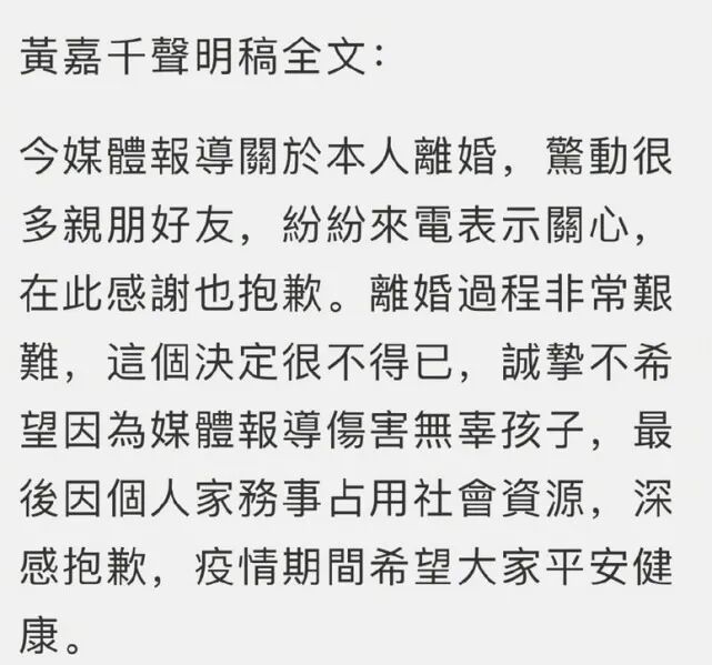 黄嘉千发布了离婚声明,称这个决定是迫不得已,还向法院提供了家暴验伤单。