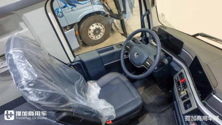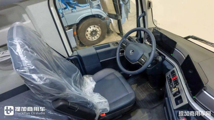 进入车内,12.3英寸悬浮式全液晶仪表+15.6英寸智能中控大屏构成的沉浸式数字座舱映入眼帘。结合怀挡设计、双辐式多功能方向盘等配置,营造出乘用车般的豪华与科技氛围,让重卡驾驶体验迈向全新维度。