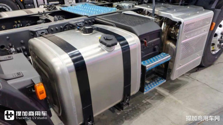 底盘左侧油箱采用轻量化铝合金材料,应用双腔结构,同时容纳柴油与尿素溶液