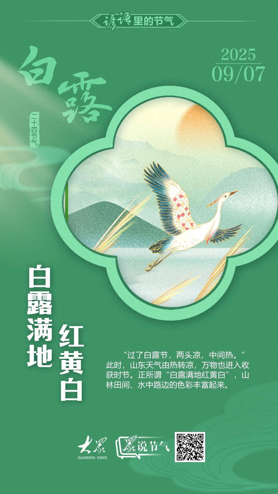 谚语说:“过了白露节,两头凉,中间热。”此时,天气逐渐转凉,白天阳光尚有热感,等到太阳落山,气温便很快下降。夜间,空气中的水汽凝结成细小水滴,附着在花草树木上。清晨,在阳光的照射下,晶莹剔透、洁白无瑕,“白露”因此得名。