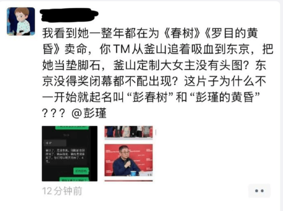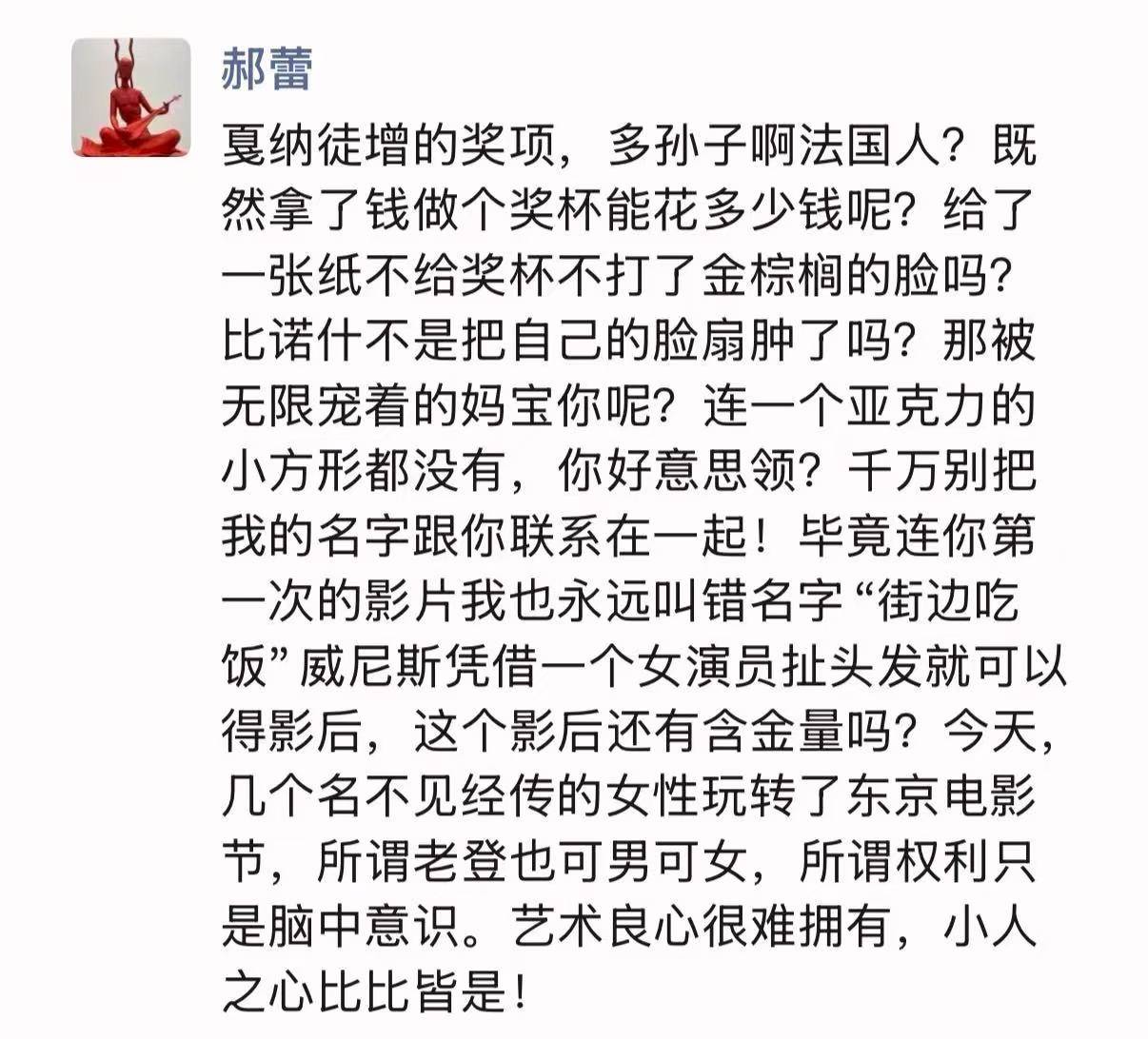 “今天,几个名不见经传的女性玩转了东京电影节,所谓老登也可男可女,所谓权利只是脑中意识。艺术良心很难拥有,小人之心比比皆是!”